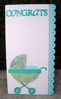 I made this simple card using shapes cut out with cricut. I cut out the letters with Paper Lace cricut cartridge and the buggy with Baby steps cricut cartridge. I then added glue with a glue pen on parts of the shapes and added glitter to them.
